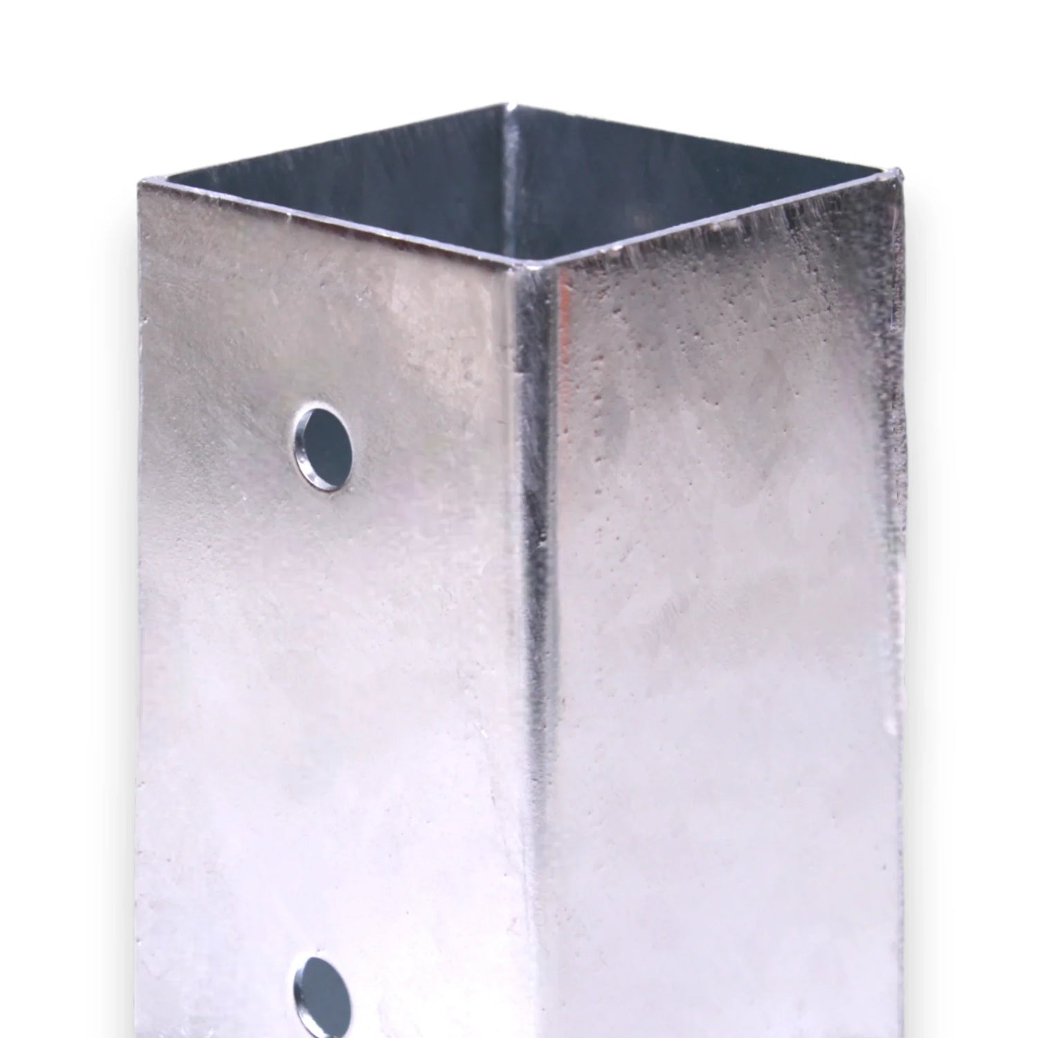 Dank der Feuerverzinkung bieten die Hülsen hervorragenden Korrosionsschutz, was sie zu einer langlebigen Lösung für Jäger-, Staketen- und Sichtschutzzäune bis zu 150 cm Höhe macht. Für eine feste Verankerung der 120 mm Vierkantpfosten verfügen die Hülsen an zwei Seiten über Löcher, durch die Pfostenträgerschrauben bequem angebracht werden können. Wir empfehlen, Löcher mit einem Holzspiralbohrer vorzubohren, um die Installation zu vereinfachen.